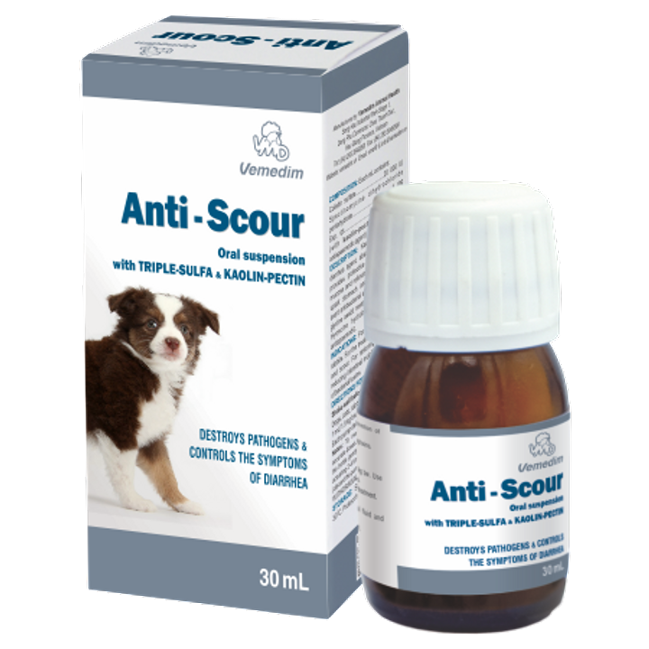 Anti-Scour 30Ml, Used For Treating And Preventing Gastrointestinal Infections And Restoring Electrolyte Balance In Animals, Contains Several Active Ingredients. These Include Sulphadimidin, Potassium Chloride, Sulphaguanidine, Magnesium Sulfate, Sulphadiazin, Calcium Gluconate, Kaolin, Sodium Chloride, Pectin, And Glycine.