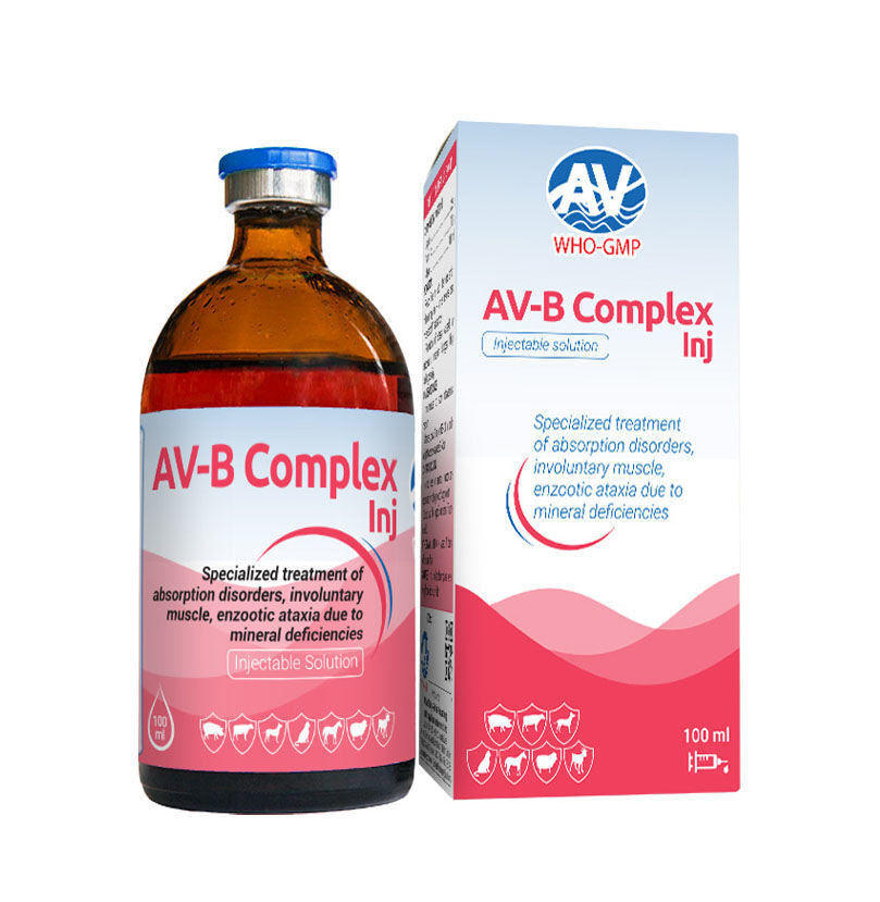 AV-B COMPLEX INJ. is a comprehensive injectable vitamin B complex formulated to support animals during periods of stress, illness, recovery, and physical fatigue. It is particularly beneficial during infections, antibiotic treatments, mineral deficiencies, and various physiological challenges affecting young and adult animals alike.