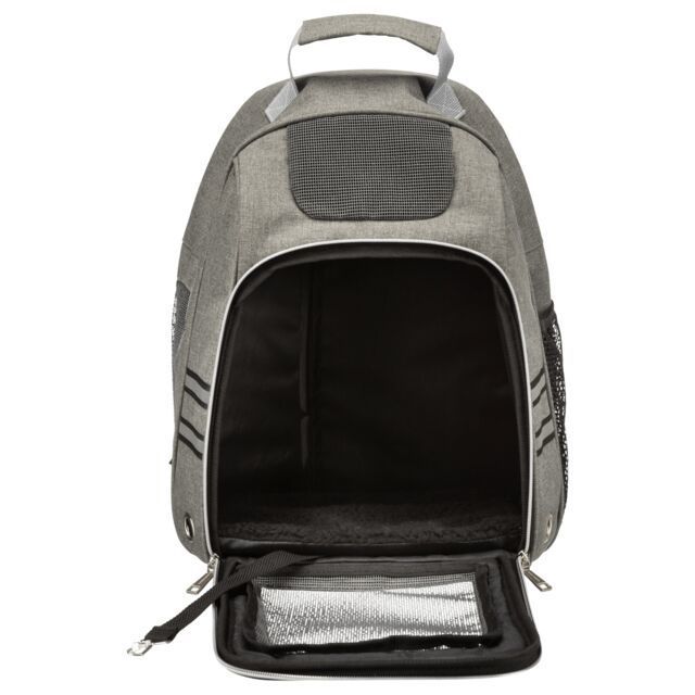 With waist strap for ideal weight distribution Stable in shape Opens from the front With net pocket With integrated short lead Padded bottom plate in lamb fur look (polyester), removable cover Reflective elements Polyester