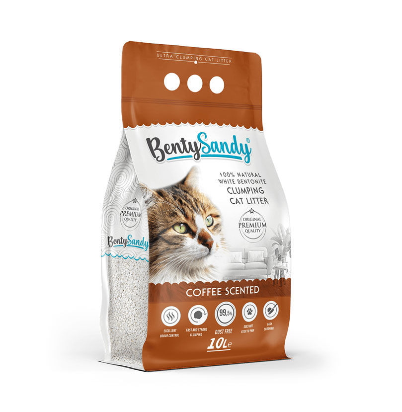 Coffee scented BentySandy stands out with its scent and has ultra clumping properties. It does not stick to the paws and is 99.5% dust-free.