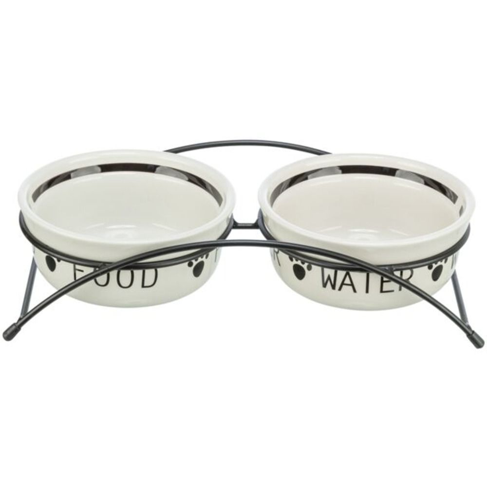 2 Ceramic Bowls With a Stand Powder Coated Metal Stand Black Non-Slip Due To Rubber Feet Feed Bowls Dishwasher Suitable ,