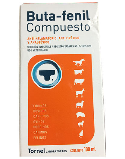 • BUTA-FENIL COMPUESTO is indicated for the treatment of arthritis, locomotive system and spine injuries (paralysis caused by the compression of nerve terminals, at the intervertebral disc level), as well as blows and inflammation that, due to pain, alter the behavior and movement pattern of the affected animal.