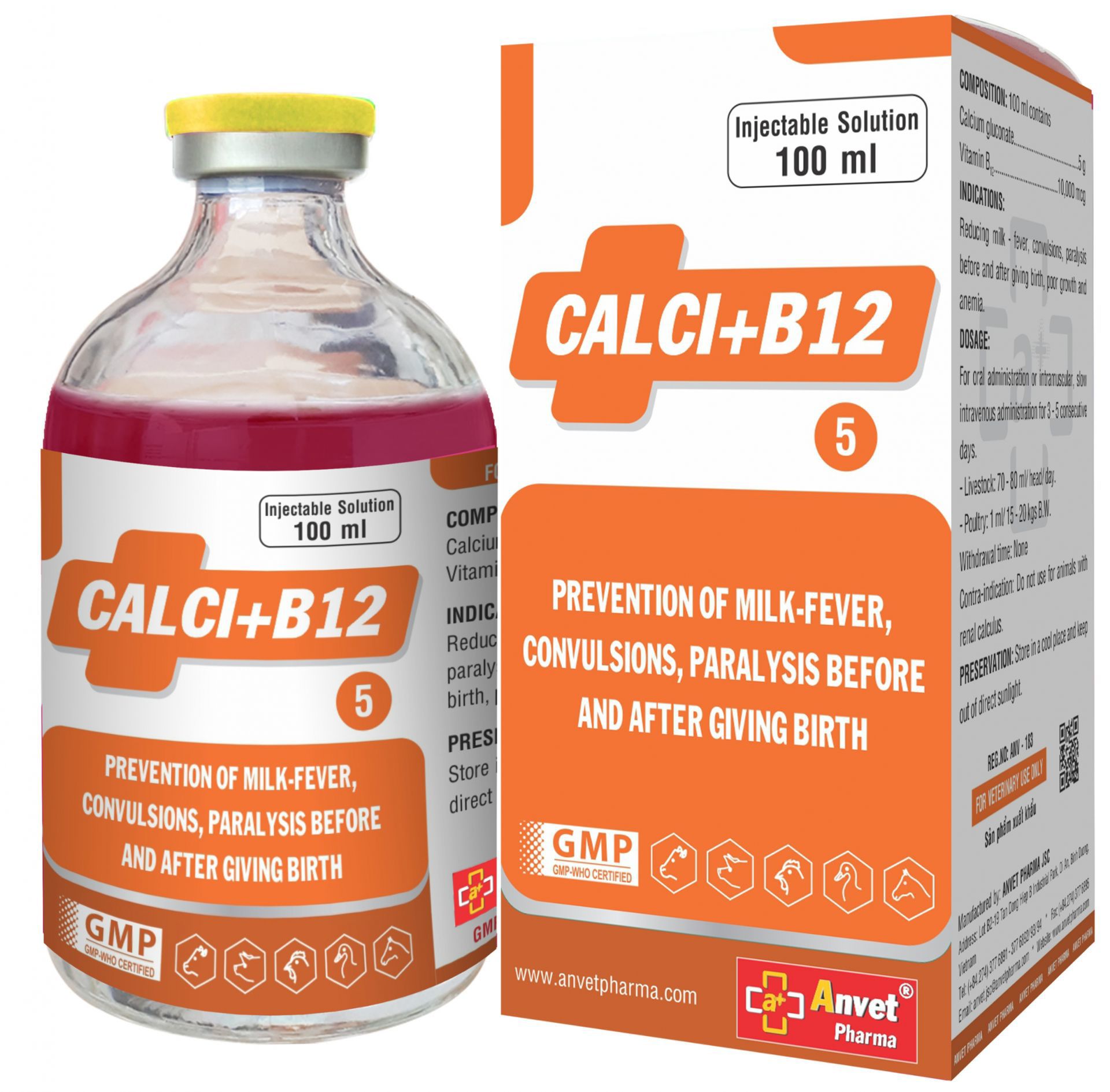 COMPOSITION: 100ml contains: Calcium gluconate Vitamin B12 INDICATIONS: Treatment of milk fever, convulsion, paralytic after and before parturition, stuntedness, anemia, low growth rate DOSAGE: IM or slowly IV administration, for 3-7 days Livestock: 10 - 20ml/ animal/ day Poultry: 1ml/ 3-5kg BW Contraindications: Do not use for animals which are renal failure PRESERVATION: Store in a cool place and keep out of direct sunlight FOR VETERINARY USE ONLY