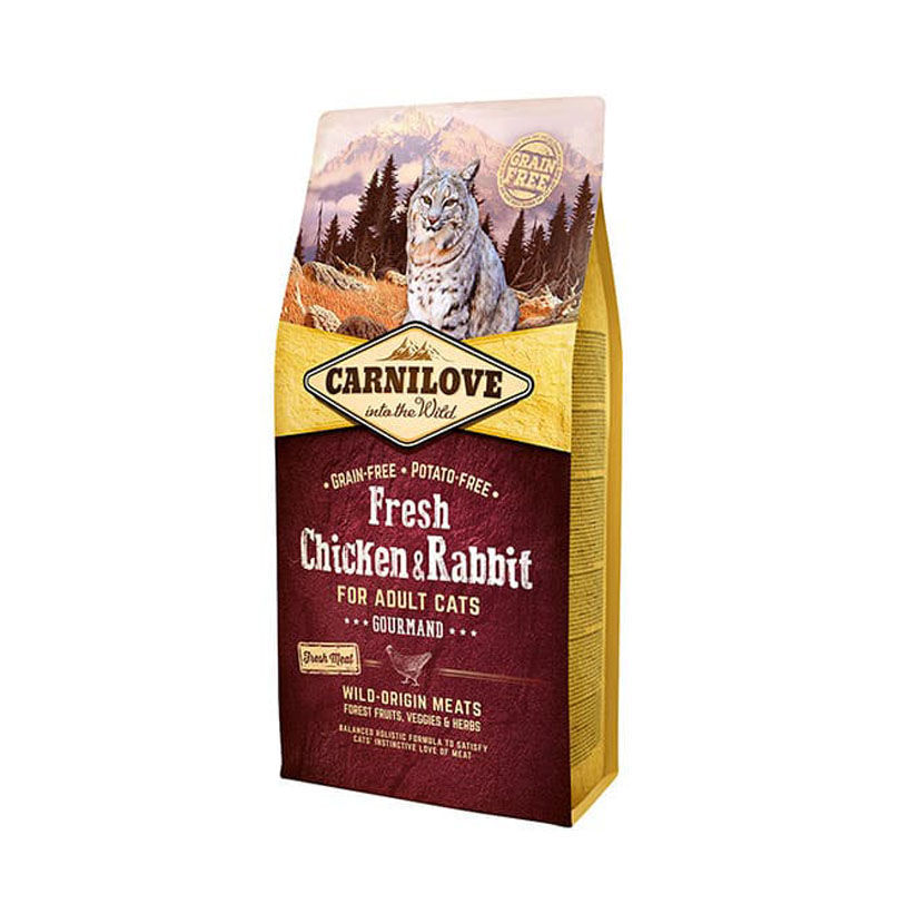 Unique and independent creatures, cats are meat eaters, full-blooded predators whose way of life is determined by a strong hunting instinct. Carnilove Fresh Chicken & Rabbit has been formulated with respect for the laws of nature and provides your feline companion with balanced nutrition rich in fresh meat combined with a variety of vegetables, berries and herbs. Returning to a natural diet supports healthy digestion and helps maintain optimal physical condition. Bursting with flavor, the top-quality natural ingredients are irresistible to even the choosiest of feline gourmands.