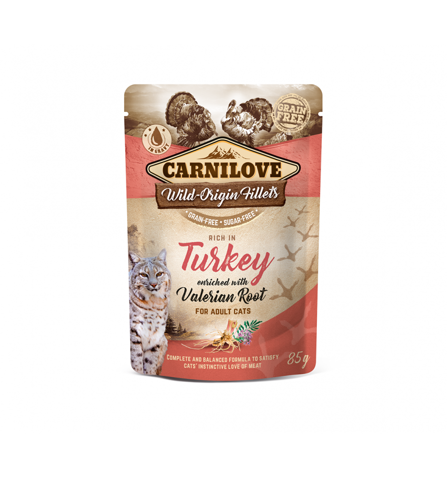 Carnilove Cat Pouch Rich in Turkey with Valerian Root is a grain-free wet cat food that comes in convenient 85g pouches.
