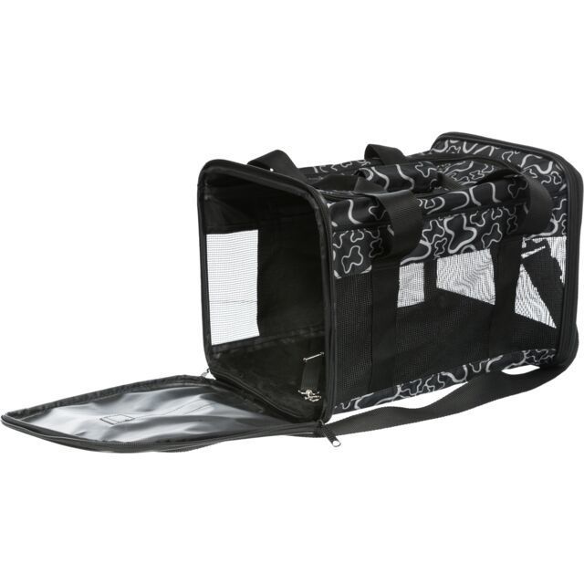 Can be opened at the top With outside pockets Removable shoulder strap With integrated short lead Bottom plate with plush cover (polyester), removable Polyester