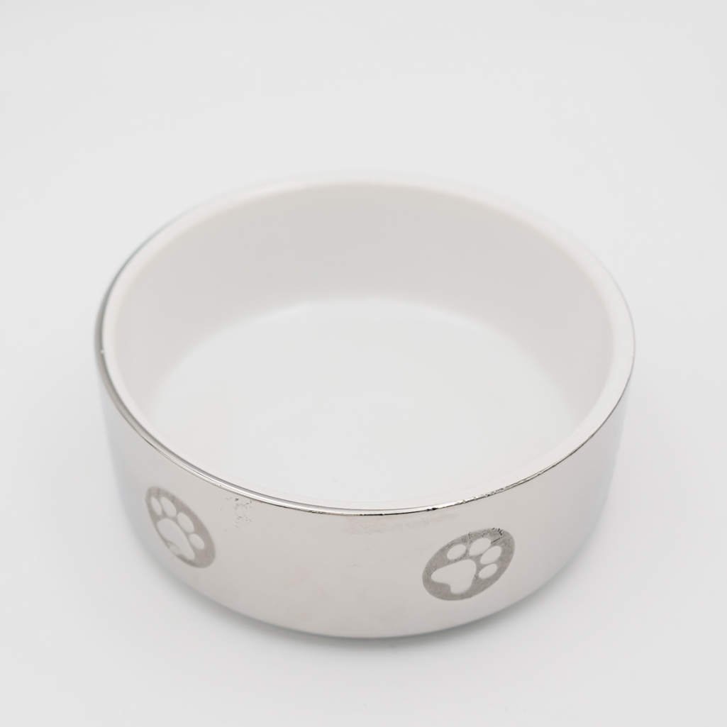The bowl's rounded shape and smooth finish make it easy to clean and maintain. The sturdy ceramic construction provides stability during use while being heavy enough to prevent tipping. The neutral metallic color scheme allows it to blend well with any home décor while the paw print adds a subtle pet-themed accent."