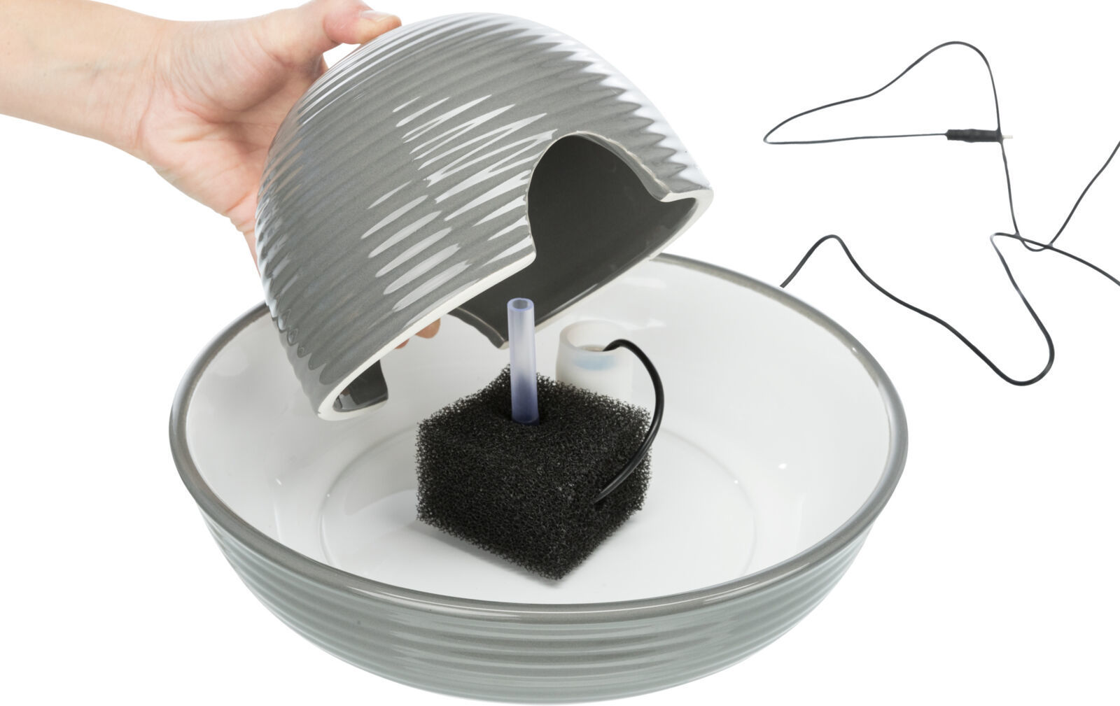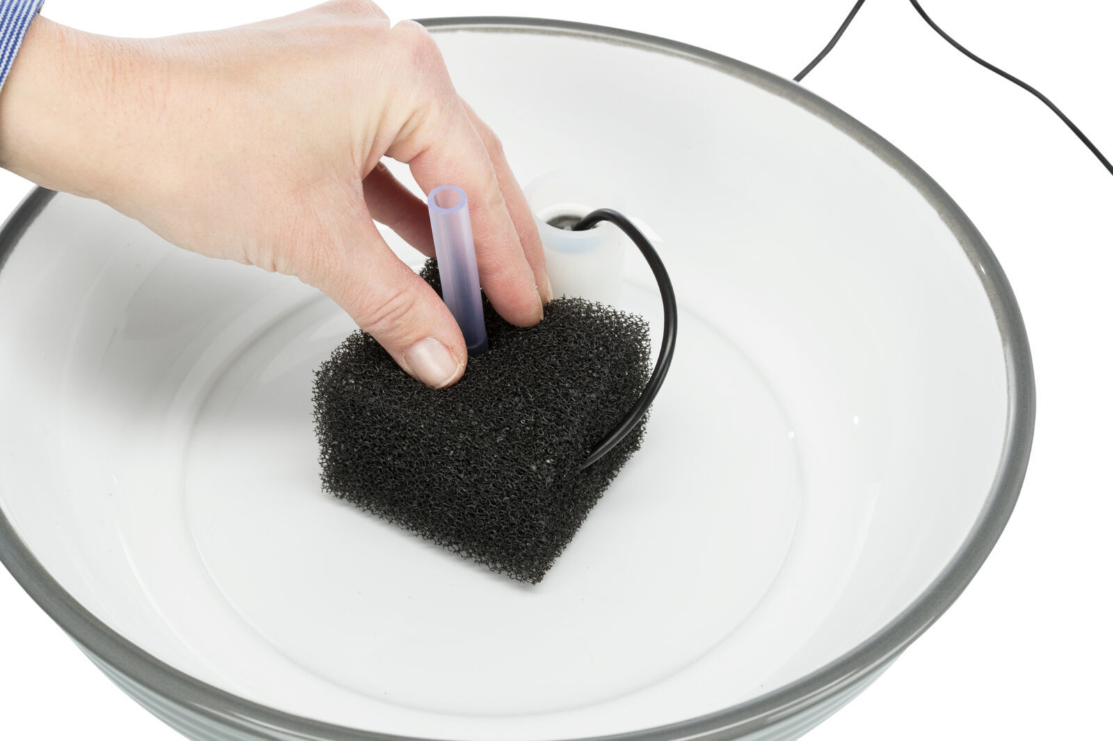 The drinking fountain is supplied with small foam rubber feet which can be swallowed by animals and children if they become detached from the product during assembly.