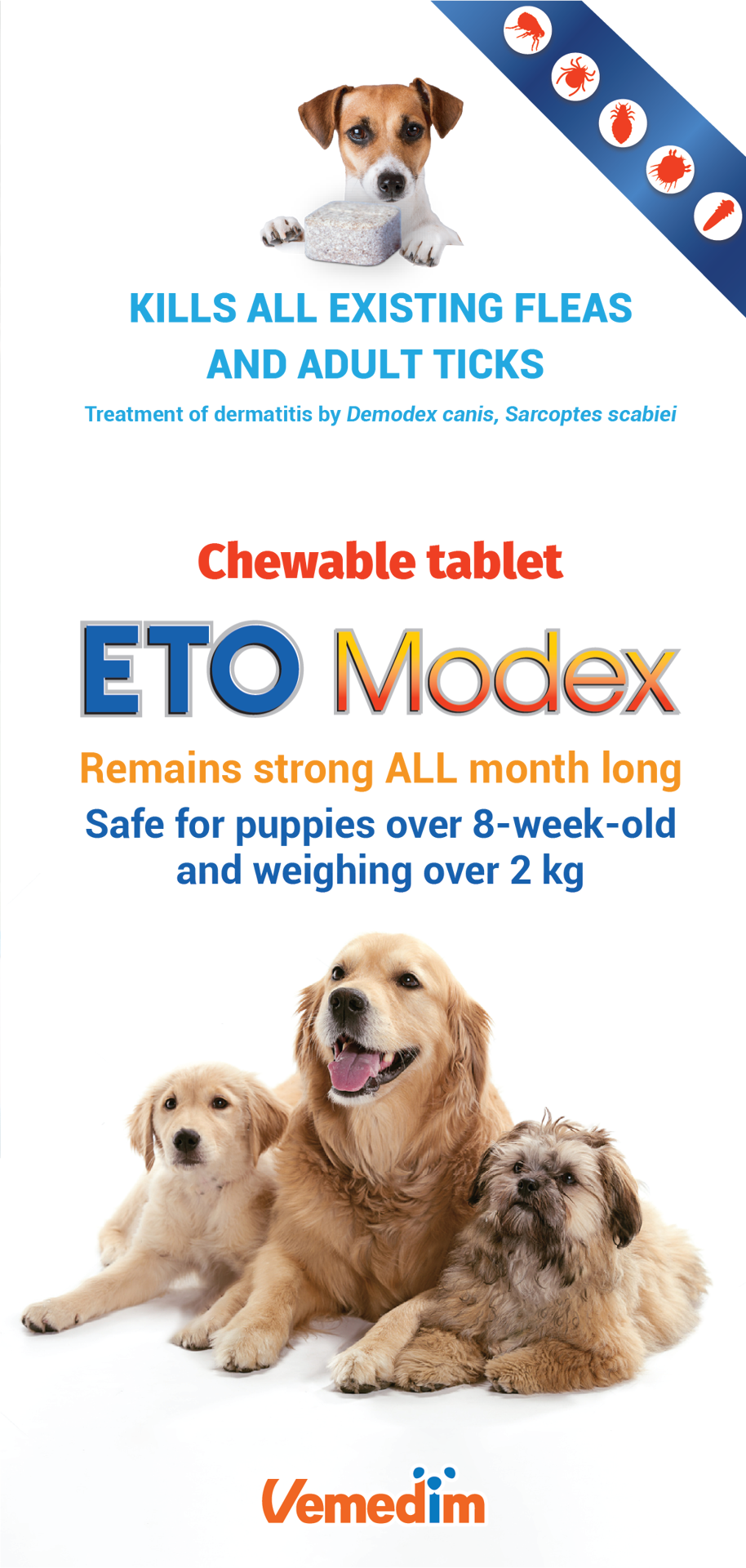 use ETO Modex once a month until 2 consecutive skin tests are negative for Demodex canis, one month apart.