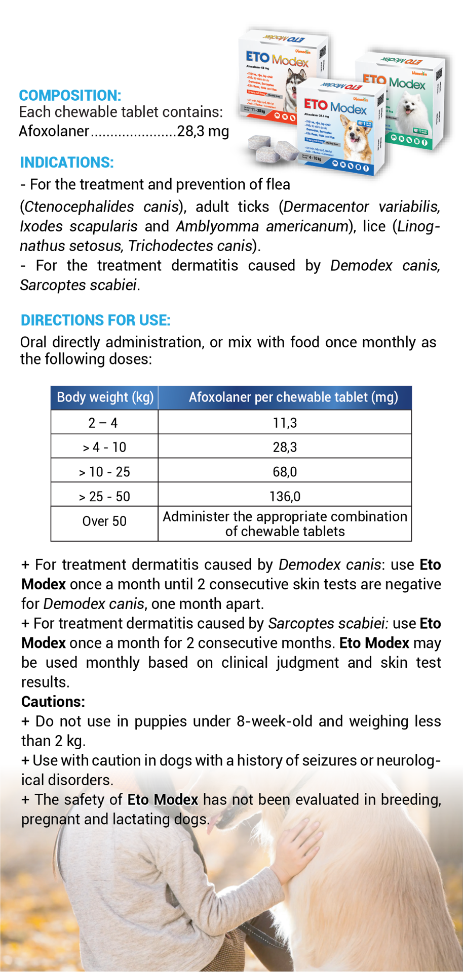 ETO Modex is indicated for the reduction of Borrelia burgdorferi infections by killing the adult tick ( Ixodes scapulari s) which are the vectors.