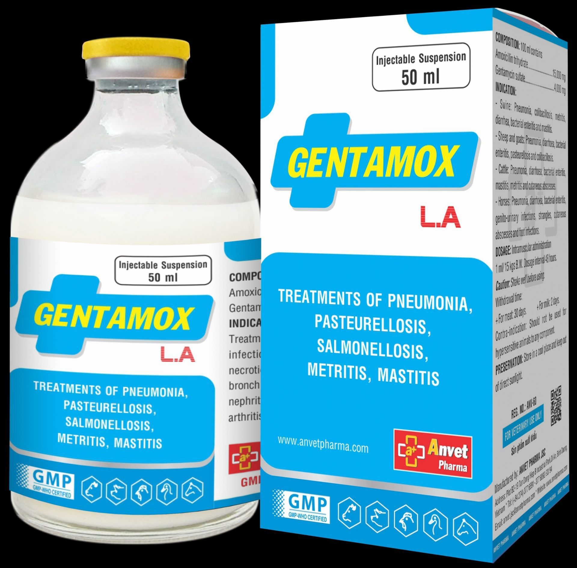 COMPOSITION: Amoxicillin trihydrate Gentamycin sulfate INDICATION: Swine: Pneumonia, colibacillosis, metritis, diarrhea, bacterial enteritis and mastitis. Sheep and goats: Pneumonia, diarrhea, bacterial enteritis, pasteurellosis and colibacillosis. Cattle: Pneumonia, diarrhea, bacterial enteritis, mastitis, metritis and cutaneous abscesses. Horses: Pneumonia, diarrhea, bacterial enteritis, genito-urinary infections, strangles, cutaneous abscesses and foot infections DOSAGE: Intramuscular administration: 1 ml/ 15 kgs B.W. Dosage interval 48 hours. Caution: Shake well before using. Withdrawal time: For meat: 30 days. For milk: 2 days. Contra-indications: Should not be used for hypersensitive animals to any component. PRESERVATION: Store in a cool place and keep out of direct sunlight. FOR VETERINARY USE ONLY