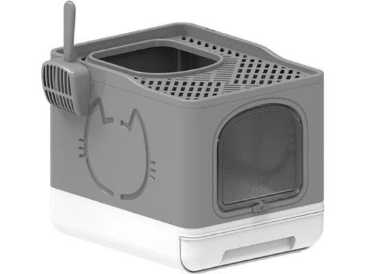 Top and front entrance litter Front entrance can be locked Anti-tracking Knock down for easy storage and shipping Compatible hole for cat litter scoop Dimension: 49.6 x 38.8 x 40.7 cm