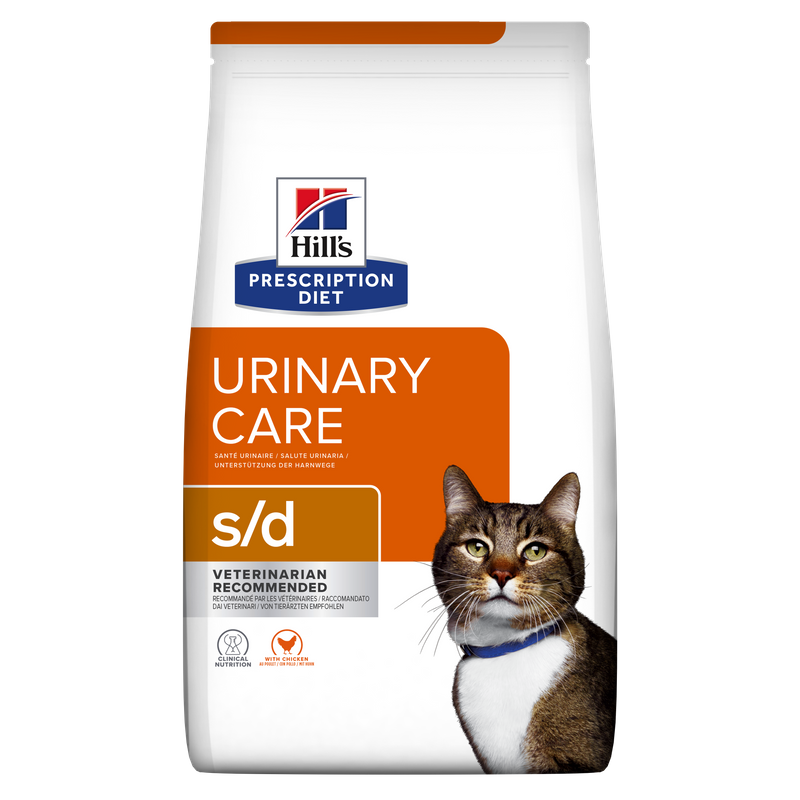 Hill's Prescription Diet Cat s/d is a specially formulated dry cat food that supports your cat's urinary health by dissolving struvite stones. In fact, s/d is clinically proven to dissolve these stones in just 6 days.