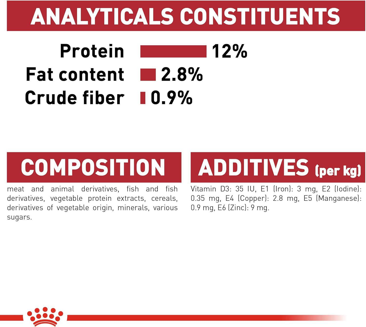 Protein: 12% - Fat content: 2.8% - Crude ash: 1.5% - Crude fibres: 0.9% - Moisture: 79.5%.