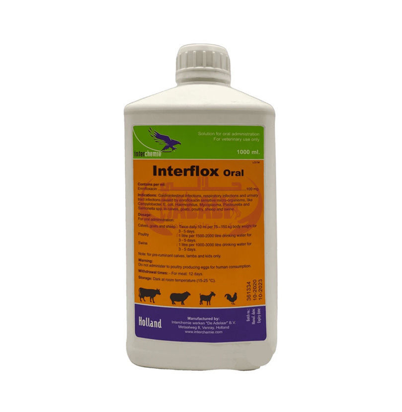 Gastrointestinal infections, respiratory infections and urinary tract infections caused by enrofloxacin-sensitive microorganisms, like Campylobacter spp., E. coli, Haemophilus spp., Mycoplasma spp., Pasteurella spp. and Salmonella spp. in calves, sheep, goats, swine and poultry.