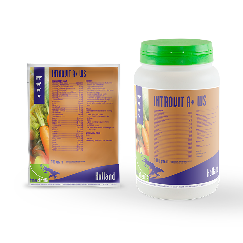 Introvit A+ WS is a powder composed of vitamins and amino acids.