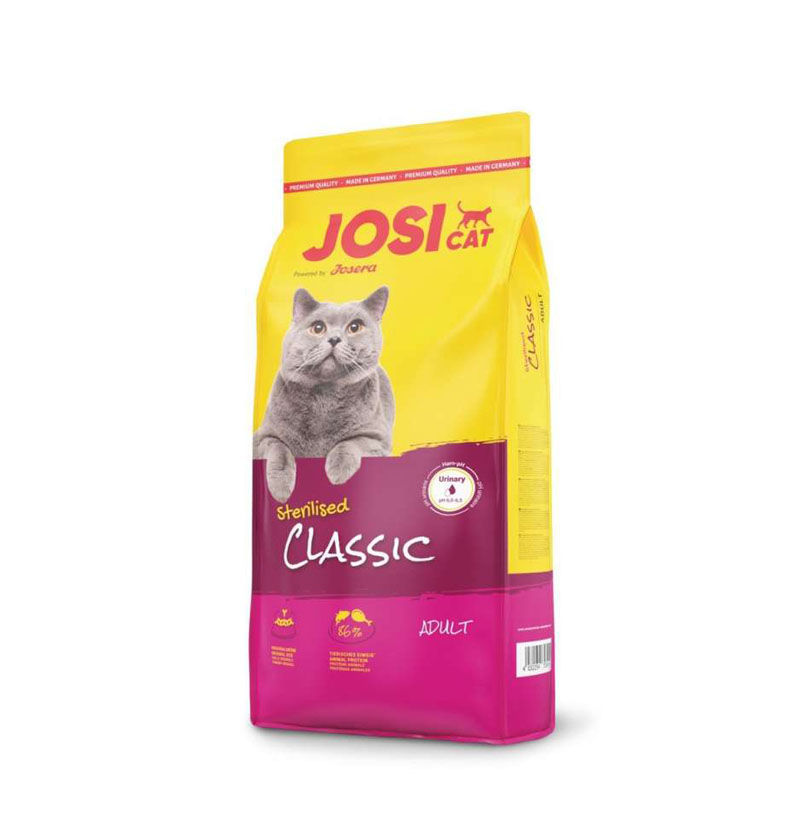 Josicat Sterilised Classic is a complete cat feed, it has whole grain corn, dried poultry protein, rice, beet fiber, greaves, poultry fat, hydrolyzed poultry protein, hydrolyzed animal protein, plant fiber, dried salmon protein, hydrolyzed poultry liver, minerals, ground chicory root (natural source of inulin).