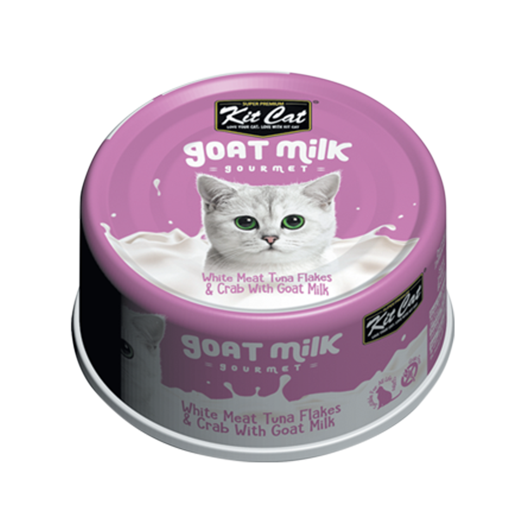 Kit Cat White Meat Tuna Flakes & Crab with Goat Milk is a premium wet cat food that combines tender white meat tuna flakes and crab meat in a nourishing goat milk formula.