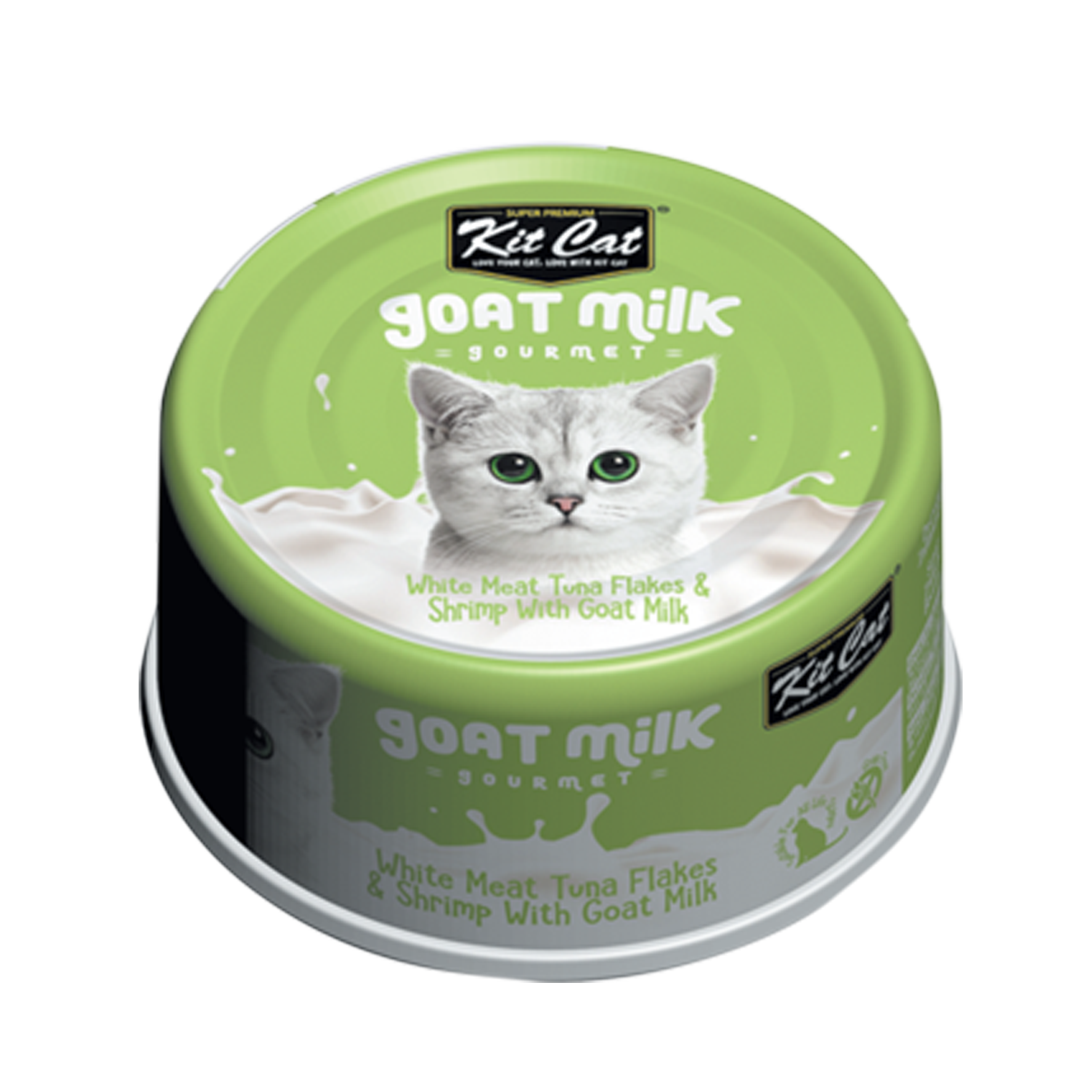 Kit Cat White Meat Tuna Flakes & Shrimp with Goat Milk is a premium cat food that combines tender white meat tuna flakes and shrimp in a nourishing goat milk formula.