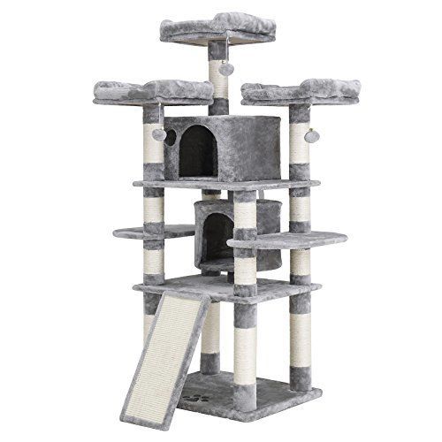 Endless fun – this cat tree offers everything and more: a sleeping area, a ladder, scratching posts and a platform for laying on to create a complete piece of cat furniture for your cat or kitten. Safe – Made from 100% environmentally friendly materials. This Kitty Tower is completely harmless to your cat. baseboard provides ultimate stability for the safety of your cat friends! Compact and portable: 60*51*170cm. Our cat tree is a real space saver and can be easily transported. Comfortable – Soft plush cushion and ladder keep the cat warm and comfortable all year round. Pressed wooden columns covered with natural sisal make it a perfect tool to maintain claws. Easy installation – with an instruction manual and all necessary