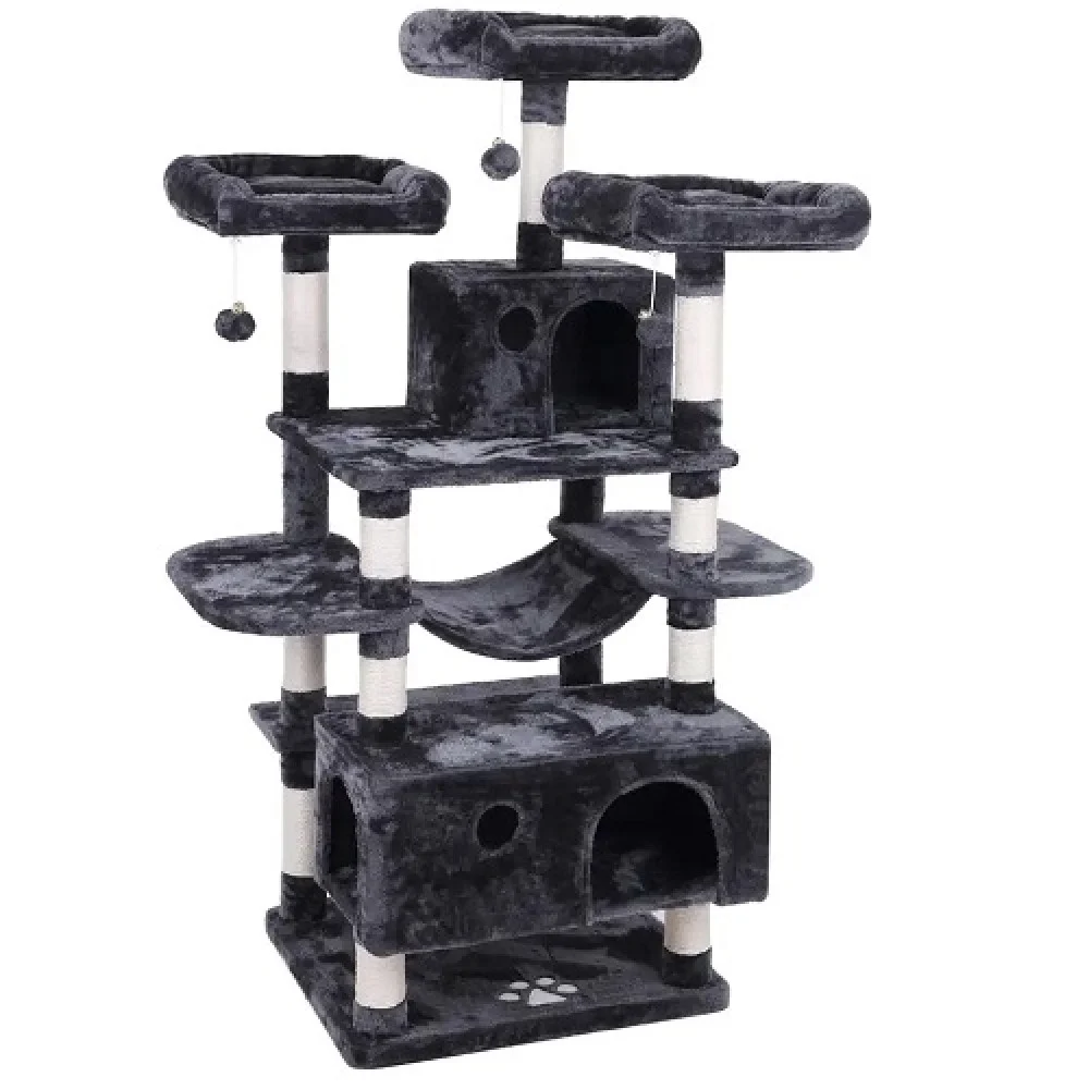 Endless fun – this cat tree offers everything and more: a sleeping area, a ladder, scratching posts and a platform for laying on to create a complete piece of cat furniture for your cat or kitten. Safe – Made from 100% environmentally friendly materials. This Kitty Tower is completely harmless to your cat. baseboard provides ultimate stability for the safety of your cat friends! Compact and portable: 60*50*160cm. Our cat tree is a real space saver and can be easily transported. Comfortable – Soft plush cushion and ladder keep the cat warm and comfortable all year round. Pressed wooden columns covered with natural sisal make it a perfect tool to maintain claws. Easy installation – with an instruction manual and all necessary