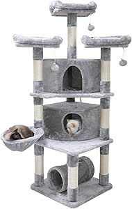 Endless fun – this cat tree offers everything and more: a sleeping area, a ladder, scratching posts and a platform for laying on to create a complete piece of cat furniture for your cat or kitten. Safe – Made from 100% environmentally friendly materials. This Kitty Tower is completely harmless to your cat. baseboard provides ultimate stability for the safety of your cat friends! Compact and portable: 55x55x165cm. Our cat tree is a real space saver and can be easily transported. Comfortable – Soft plush cushion and ladder keep the cat warm and comfortable all year round. Pressed wooden columns covered with natural sisal make it a perfect tool to maintain claws. Easy installation – with an instruction manual and all necessary