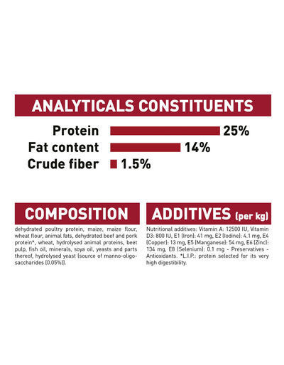 Dehydrated poultry protein, corn, corn flour, wheat flour, animal fat, wheat, animal protein hydrolyzate, beet pulp, fish oil, soy oil, yeast and yeast components, mineral salts, hydrolyzate of yeast (source of manno-oligosaccharides (0.05%)).