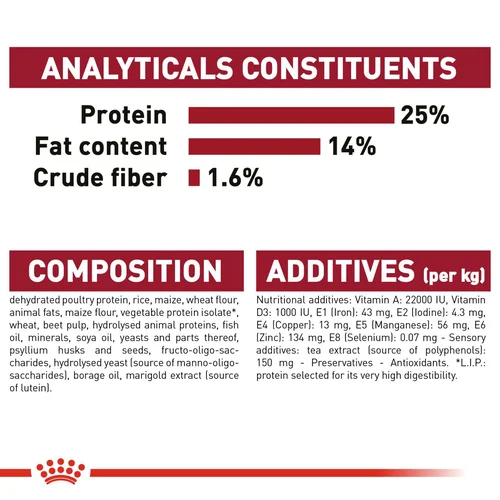 Protein: 25.0% - Fat content: 14.0% - Crude ash: 5.2% - Crude fibres: 1.6% - Per kg: EPA/DHA: 4 g.