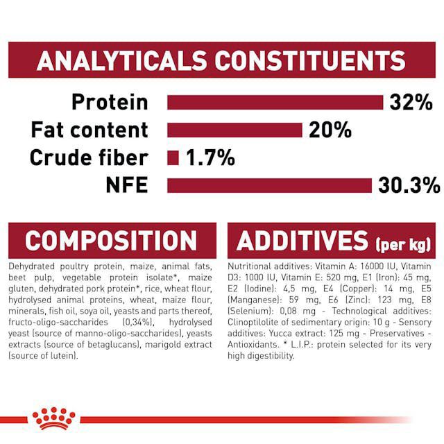Combination of nutrients with high quality protein (L.I.P.*) and prebiotics (FOS) to support digestive health and balance of intestinal flora, which contributes to good stool quality. *Protein selected for its very high digestibility.