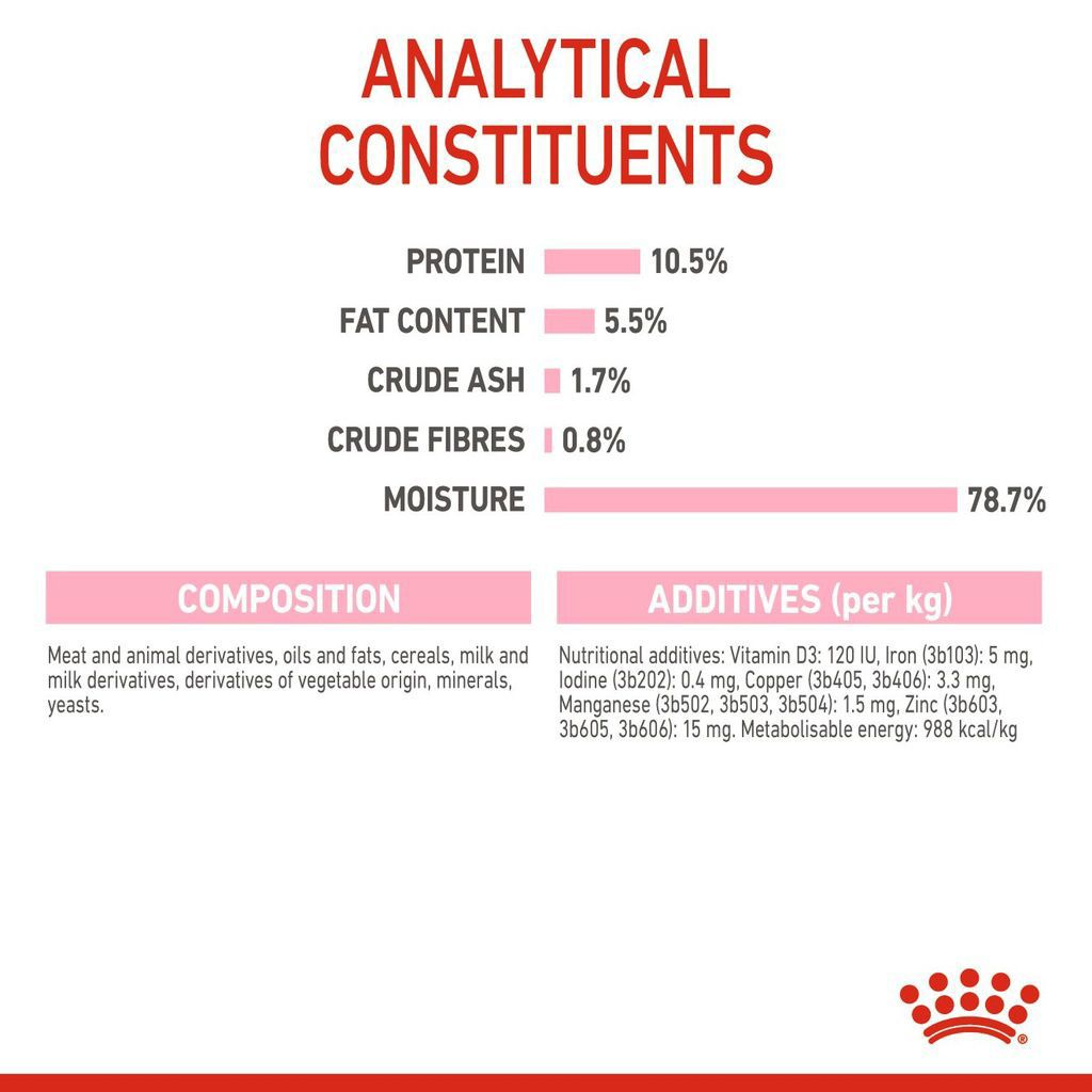 Royal Canin Mother & Babycat Ultra-Soft Mousse in Sauce wet cat food is formulated for the specific needs of growing baby kittens (1-4 months) and queen cats (pregnant or nursing)