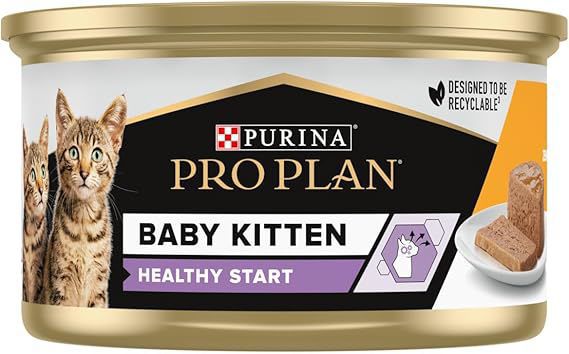 Purina Pro Plan Baby Kitten Mousse with Chicken is a specially formulated wet cat food designed for young kittens, featuring a smooth mousse texture that's easy to eat and digest.