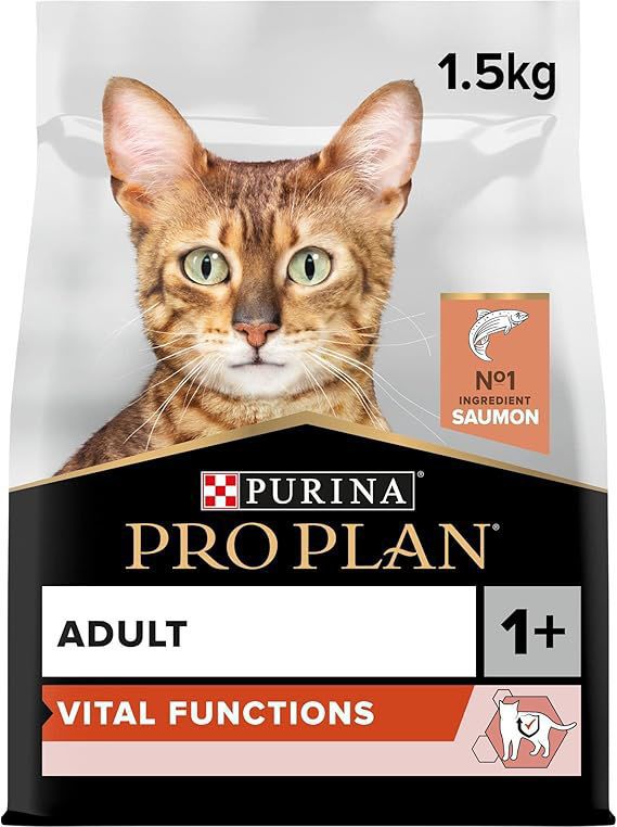 Purina Pro Plan Vital Function Adult is a premium dry cat food formulated with salmon as the primary ingredient.