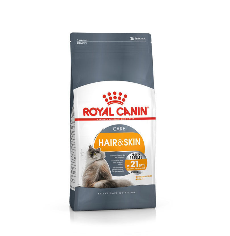 Royal Canin Hair & Skin Care is an exclusive complex of nutrients that help to support the skin's barrier role. It contains high-quality proteins, including specific amino acids, to maintain healthy hair growth and skin renewal. Royal Canin Hair & Skin Care includes an essential combination of omega-3 and omega-6 fatty acids for beneficial effects on skin health and coat condition. The formula also contains soya and borage oil (rich in gamma linoleic acids) as well as fish oil to help your cat maintain a healthy, glossy coat. Additionally, Royal Canin Hair & Skin Care has been designed with several other key nutrients, such as B vitamins, amino acids, zinc, and copper. Together, these nourish your cat's skin and fur by supporting the skin's barrier function and maintaining optimal skin beauty as well as hair strength and density. The exclusive use of Hair & Skin Care from Royal Canin has been clinically proven to significantly increase coat shine after just 21 days of use.