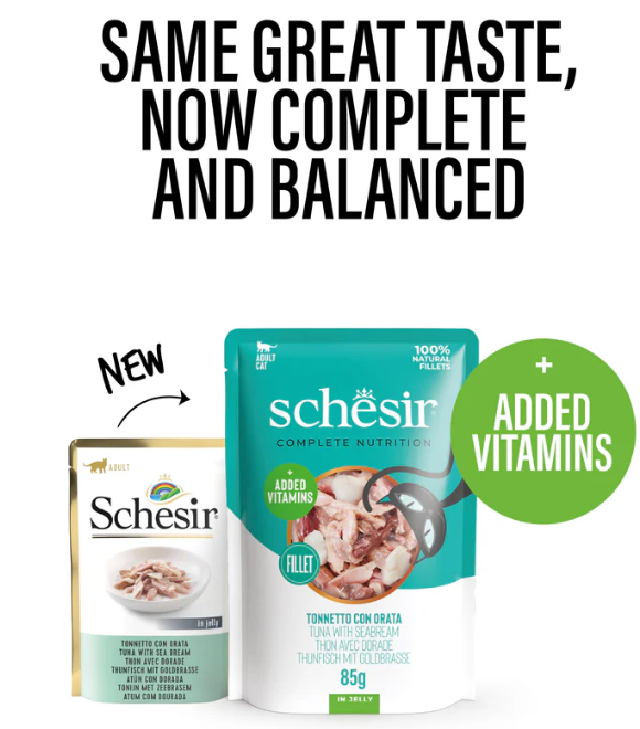 Schesir Cat Pouch Tuna with Seabream is a premium wet cat food that combines tender tuna and seabream in a delicate jelly.