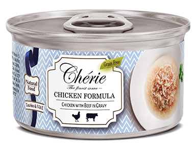 Delicious shredded white meat chicken add tasty beef with rich gravy in an enticing and appetizing entrées for your lovely cats. With simply natural tastes and Chérie signature gravy is a luxury taste sensation for cats. Each signature recipe features delicate cuts of natural meat in delicious gravy.