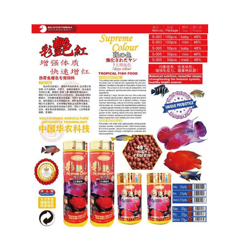 specifications : Topka Suprem Colour Enhancer ..is produced by German formula and discreet processing specially for all min tropical fish.Floating Pellets is suitable for the habbit of tropical fish dietting It contains extremely proportional balancing natural multi-vitamins to enhance vigors & colors of tropical fish. It contains comprehensive vitamins which Naturely strengthens the immune system and fish's ability to resist disease, also additived many kinds of natural color enhancing elements: Astaxanthin、Lutein ect. This ensures that the fish in beautiful body shape and the tropical fish body colour is gorgeous