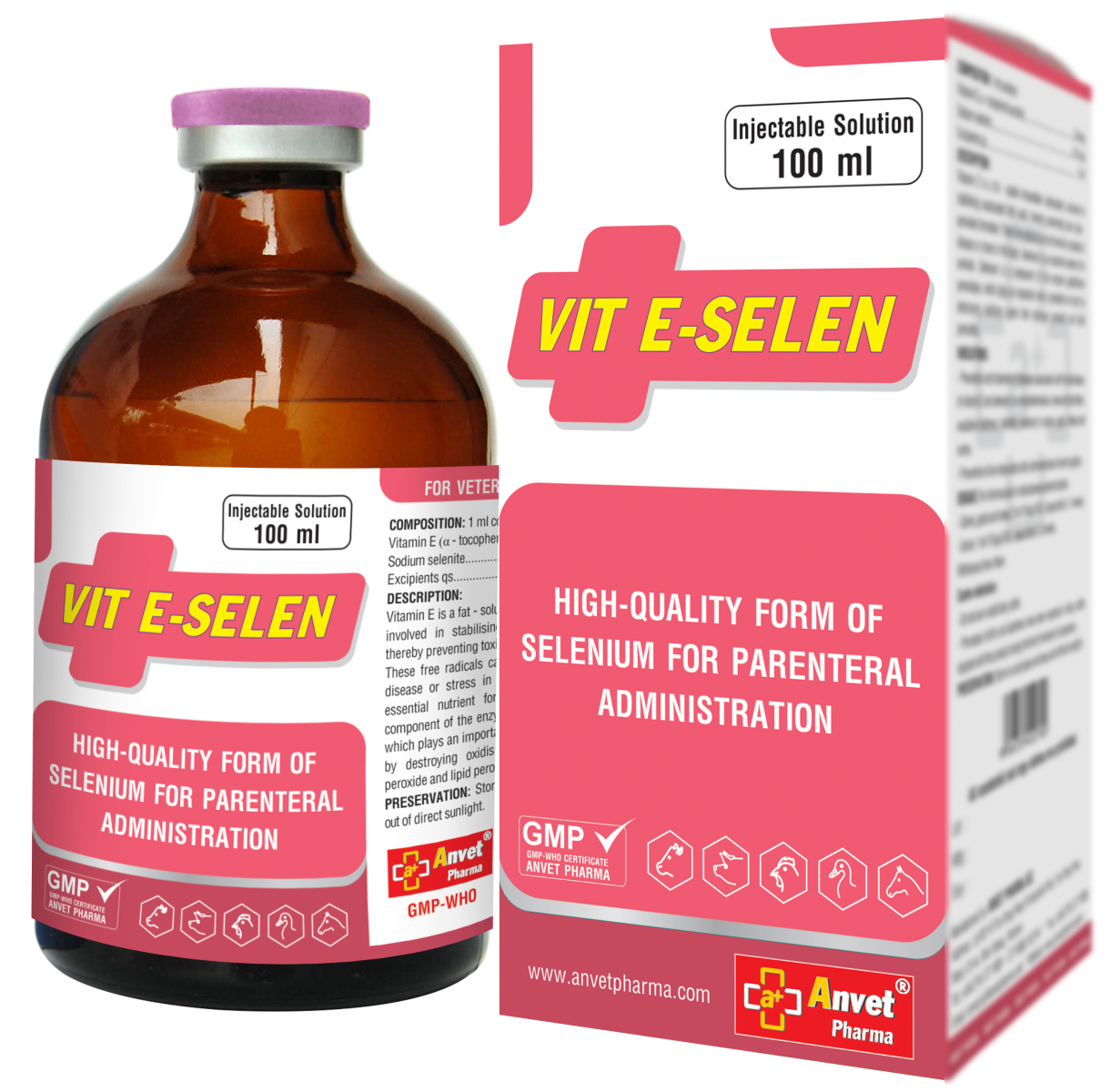 COMPOSITION Vitamin E (α-tocopherol acetate) Sodium selenite INDICATIONS - Prevention and treatment of diseases associated with the deficiency of vitamin E and selenium (as encephalomalacia, muscular dystrophy, exudative diathesis, infertility problems) in calves, goats, sheep and swine. - Prevention of iron intoxication after administration of iron to piglets. METHOD OF ADMINISTRATION For intramuscular or subcutaneous administration - Calves, goats and sheep: 2 ml/ 10 kg BW, repeat after 2 – 3 weeks. - Swine: 1 ml/ 10 kg BW, repeat after 2 – 3 weeks. Withdrawal time: None Contra-indication: - Do not use in adult dairy cattle - Premature births and abortions have been reported in dairy cattle injected with this product during the third trimester of pregnancy. PRESERVATION: Store in a cool place and keep out of direct sunlight FOR VETERINARY USE ONLY