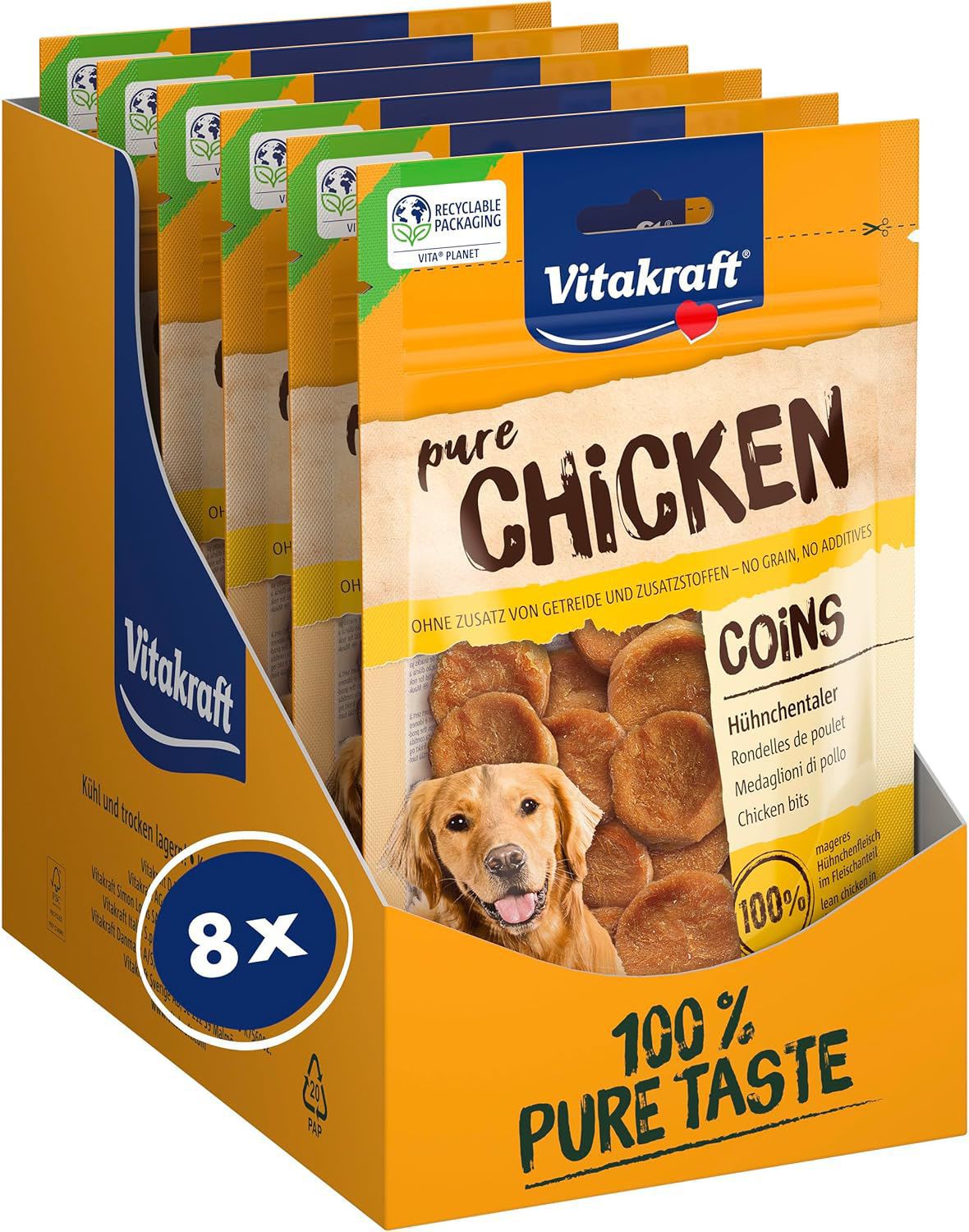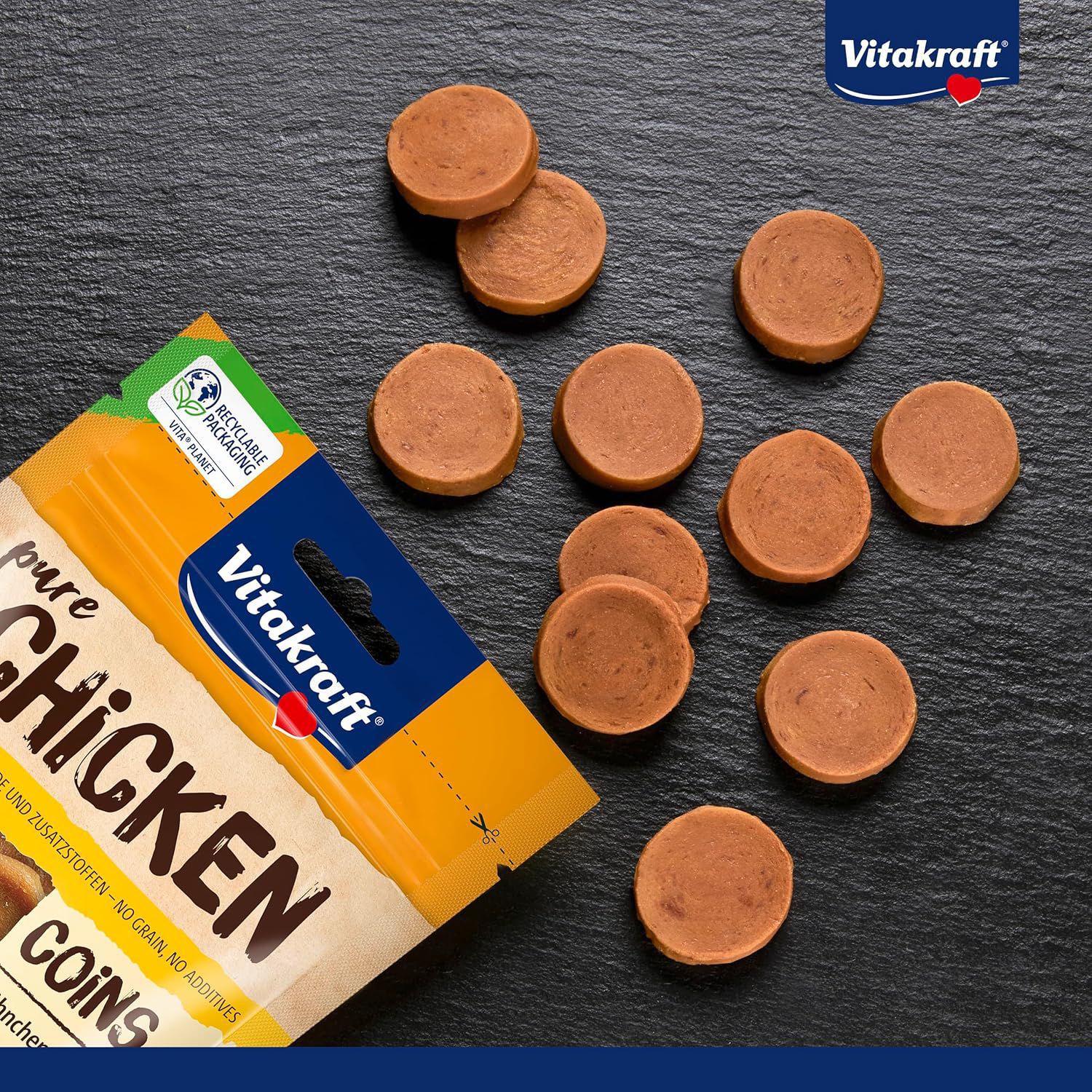 Vitakraft Dog Coins Chicken are small, crunchy treats that dogs adore.