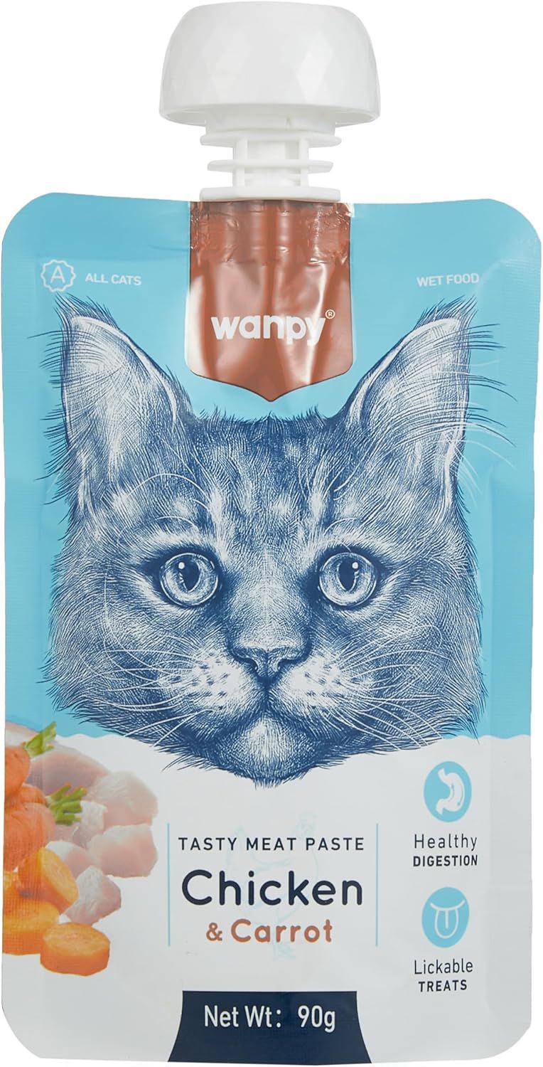 Liquid meat paste treats with chicken and carrots for your cats.